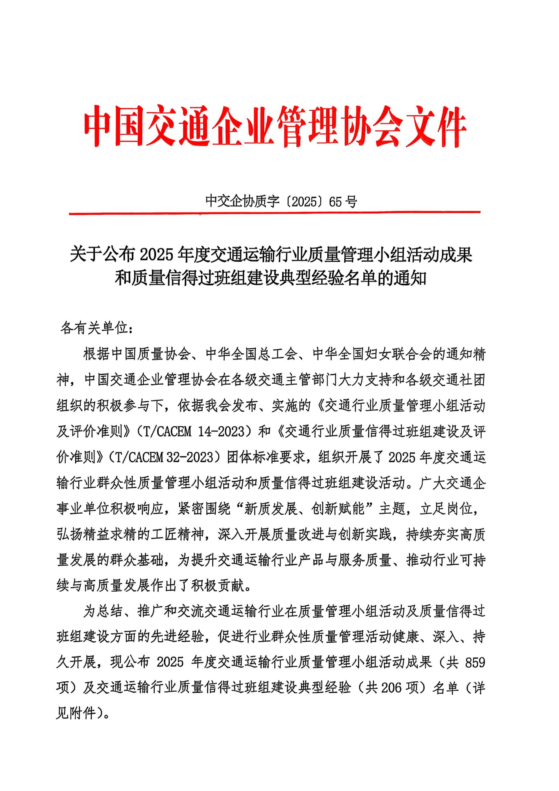 2025年11月20日,中國(guó)交通企業(yè)管理協(xié)會(huì)公布了年度交通運(yùn)輸行業(yè)質(zhì)量管理小組活動(dòng)成果獲獎(jiǎng)名單。開(kāi)發(fā)路東延快速化改造工程“瑞沃···